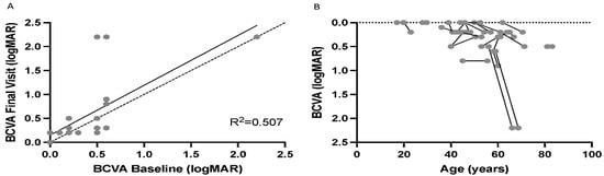 Mean best corrected visual acuity (BCVA) analysis from the right eye of the 33 patients at baseline was 0.29 ± 0.41 logarithm of the minimum angle of resolution (logMAR) (range 0.0–2.2). Twenty-nine patients had at least one follow-up visit and had a mean BCVA of 0.31 ± 0.43 logMAR in their right eye at baseline and 0.47 ± 0.63 logMAR at the most recent (final) visit over a duration of 4.5 ± 3.9 years. Correlation between the change in BCVA at baseline and the most recent follow-up visit demonstrated a trend of worsening BCVA over time (Figure 2A). The change in BCVA of each patient at baseline and most recent visit as a function of age is illustrated in Figure 2B.