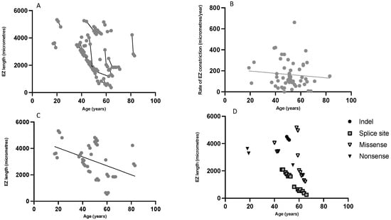 The EZ was measurable in 23 patients from the right eye. EZ length measured at each visit is shown in Figure 3A. Nine were excluded from the SD-OCT analysis as the EZ extended beyond the boundaries of the image; these nine patients had a mean age of 52.5 ± 13.5 years. The mean rate of constriction was 178 µm ± 161 µm per year (range 1.0–661 µm per year). There was no correlation between rate of EZ length constriction with age (R2 = 0.009 p = 0.48) (Figure 3B). Figure 3C represents the correlation of EZ length against age for each patient who had three visits, each with an interval of 10–14 months. This was best described by a linear or exponential decay, but not logarithmic trend (Supplementary Figure S1). A fitted linear trend shows a detectable decrease in EZ length evident within a clinical trial setting for all the patients represented (R2 = 0.194, p = 0.004). Figure 3D demonstrates EZ length correlation with age for the subtypes of patients with homozygous CNGB1 mutations. From these data, no specific genotype/phenotype correlations can be inferred, possibly due to limited patient numbers and follow-ups coupled with a diverse range of CNGB1 variants.
