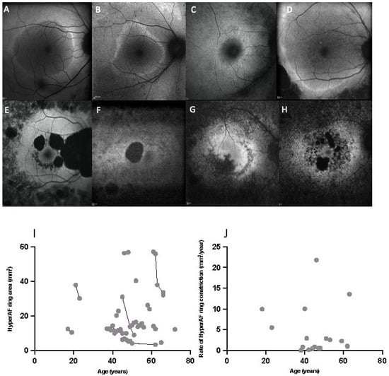 - Lima, L.H.; Burke, T.; Greenstein, V.C.; Chou, C.L.; Cella, W.; Yannuzzi, L.A.; Tsang, S.H. Progressive constriction of the hyperautofluorescent ring in retinitis pigmentosa. Am. J. Ophthalmol. 2012, 153, 718–727. [Google Scholar] [CrossRef] [Green Version]