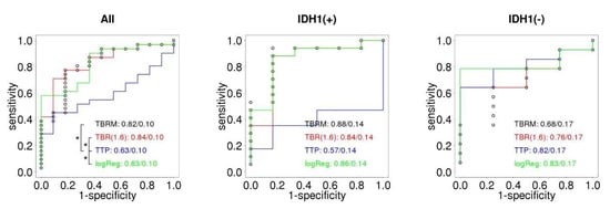 Receiver–operator characteristic (ROC) curves in classifying tumor outcome based on FET-derived parameters for different IDH mutation status groups. All: all patients in the study. IDH1(m): patients with mutated IDH gene. IDH1(wt): patients with IDH wild type. TBRM is TBRmax, TBR(1.6) is TBRmean at SUV 1.6 g/mL cutoff, TTP is time to peak and log Reg is the logistic regression model. The image shows AUC values with associated standard deviation. The asterisk associated brackets identify variables with statistically significant ROC curves as evaluated by a non-parametric significance test.
