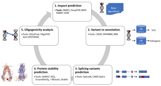 The tools presented in this review offer many possibilities in the reanalyses of NGS datasets to increase the known information for a variant of concern. The more knowledge there is about the impact of a variant on protein conformation, splicing and even RNA/protein interactions, the better the identification and interpretation of disease-causing variants.