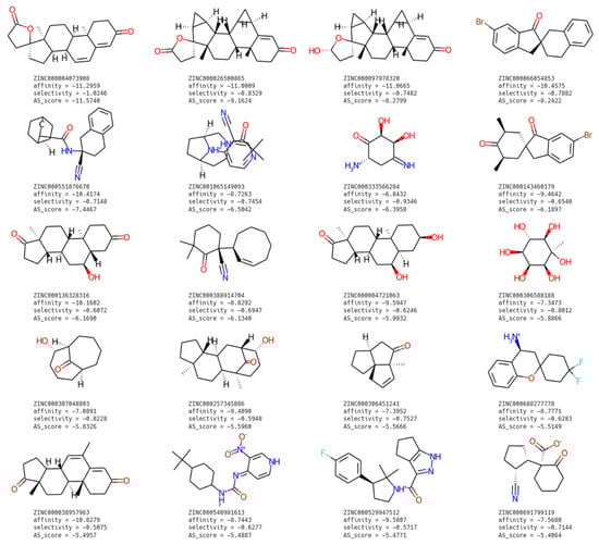 The affinity against the five targets, the best negative target (NT) affinity, the selectivity and the AS_score (see the Discussion section for the definitions), of the best ligands from our computation are listed in Table 1. Table 2 contains the SMILES strings for such compounds.