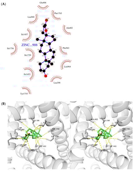 Figure 4A,B, respectively, show the LigPlot+ [] depiction of the ligand ZINC000004073908 interactions, and the analogous visualization with ChimeraX [] (cross-eye stereoimage), in which we mapped the interactions as detected by PLIP [].