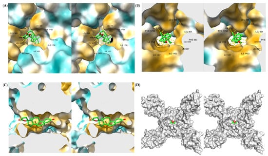 The cross-eye stereoimages shown in Figure 5A,B illustrate the ligand location relative to the protein surface, depicted with hydrophobicity coloring, and the PLIP-detected interactions as shown in Figure 4B. As can be noticed, the terminal section of the pore exhibits a highly hydrophobic surface (gold color), which is leveraged by this ligand to form such a high number of hydrophobic contacts.