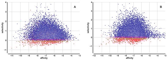 The best 1000 ligands from the above docking runs as ranked by AS_score (−affinity × selectivity, see Discussion section) were selected for a refinement run, where they were docked with exhaustiveness set to 32, but otherwise similarly to before. An exhaustiveness of 32 is among the highest used in the literature.