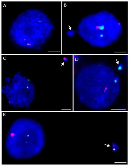 In the control nuclei two signals from 5S rDNA and two signals from 35S rDNA were observed (Figure 1A), which corresponds to the number of rDNA loci that are present in B. distachyon genome. In the case of MH-treated nuclei with MN, four situations were discerned: (1) no rDNA signal in MN; (2) one 5S rDNA signal in MN; (3) one 35S rDNA signal in MN; and (4) both 5S and 35S rDNA signals in MN (Figure 1B–E, respectively). We analyzed the frequencies of MN with signals of 5S and/or 35S rDNA in B. distachyon cells subjected to different post-treatment times: 0 h, 10 h, 20 h, following MH treatment (Figure 2).