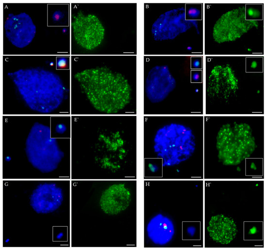 The FISH with 5S and 25S rDNA as probes and immunocytochemical detection of 5-methylcytosine (5mC) applied to the same nuclei have enabled the analysis of the occurrence of DNA methylation precisely in the rDNA sites (Figure 3). Based on the diversity of signals we distinguished two main categories of MN with rDNA: with 5mC signals (Figure 3B,B`,D,D`,F,F`) and without 5mC signals (Figure 3A,A`,C,C`,E,E`). The MN without rDNA foci are shown in Figure 3G,H. The last group could also be divided into two subsets: with and without 5mC signals (Figure 3G`,H`, respectively).