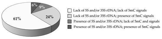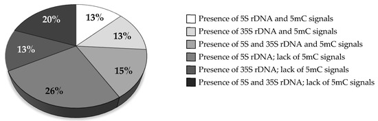 We observed that the frequency of MNs carrying only 5S rDNA without 5mC signals in this region was two times higher than of those with 5mC signals (26% vs. 13%, respectively). In contrast, no differences in terms of the presence or absence of 5mC signals were observed in the MN bearing only 35S rDNA foci. In both cases the frequencies equaled 13%. The rates of the presence or absence of 5mC signals in MN with both 5S and 25S rDNA signals were relatively similar and equaled 15% and 20%, respectively.