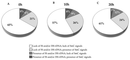 We observed mostly minor differences in the frequency of MN with specific signal composition between nuclei subjected to different post-treatment lengths (Figure 5). The MN lacking the rDNA signals dominated in all cases, with rates of 86%, 83%, and 85% for 0 h, 10 h, and 20 h of post-treatment, respectively. Interestingly, we noted a significant difference in the frequencies of MN with and without 5mC signals in the rDNA regions (3% and 12%, respectively) only in the MN subjected to 20 h of post-treatment. In contrast, only slight differences in the rates of rDNA-bearing MN with and without DNA methylation foci were observed after 0 h and 10 h of post-treatment.