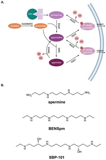 Polyamine metabolism is regulated through coordinated biosynthesis, catabolism, and transport. Ornithine decarboxylase (ODC) is a rate-limiting enzyme in polyamine biosynthesis (A). It catalyzes the formation of putrescine from L-ornithine. Spermidine synthase (SPDS) catalyzes the formation of spermidine from putrescine, and spermine synthase (SMS) assists in producing spermine from spermidine. Both reactions require decarboxylated adenosylmethionine produced by S-adenosylmethionine decarboxylase (AdoMetDC), the second rate-limiting enzyme in polyamine biosynthesis. Spermine oxidase (SMOX) directly catabolizes spermine to spermidine and produces the toxic byproducts, 3-aminopropanal and hydrogen peroxide. Alternatively, spermine can be acetylated by spermidine/spermine N1-acetltransferase (SSAT) to form N1-acetyl-spermine, which can be exported from the cell or further oxidized by polyamine oxidase (PAOX) to form spermidine. Spermidine can be catabolized to putrescine in a similar manner, forming N1-acetyl-spermidine as an intermediary. Analogues of the polyamine spermine compete for uptake into cells, and their accumulation influences polyamine metabolism (B). The well-characterized polyamine analogue, N1,N11-bisethylnorspermine, influences ODC, AdoMetDC, SSAT, and SMOX to affect polyamine metabolism. The effects of the spermine analogue, SBP-101, on polyamine metabolism are addressed in this manuscript.