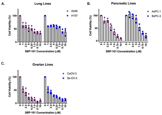 2.1. SBP-101 Treatment Reduces Cell Viability in Lung, Pancreatic, and Ovarian Cancers In Vitro
