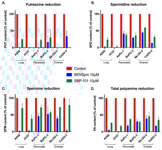 The spermine analogue BENSpm is biochemically well-characterized for its ability to influence polyamine metabolism and deplete intracellular polyamine pools. BENSpm has been shown to decrease polyamine pools by downregulating both rate-limiting biosynthetic enzymes, ODC and S-adenosylmethionine decarboxylase (AdoMetDC), as well as inducing spermidine/spermine N1-acetyltransferase (SSAT) and spermine oxidase (SMOX) [,,,]. Lung, pancreatic, and ovarian adenocarcinoma cell lines were treated for 24 h with 10 μM of either BENSpm or SBP-101 to compare how these molecules influence the polyamine pools. The treatment with SBP-101 resulted in at least a 75% reduction in putrescine levels in all of the tested cell lines, except BxPC-3 (Figure 3A). The BENSpm treatment produced a similar response with all of the cell lines (except BxPC-3), reducing the putrescine levels to below detectable amounts. The SBP-101 treatment produced a reduction in spermidine levels in all of the treated cell lines (Figure 3B). AsPc-1, BxPC-3, and CaOV-3 showed an approximately 65% reduction in the spermidine levels, while Sk-OV-3, A549, and H157 showed reductions ranging between 85% and 100%. BENSpm similarly reduced the spermidine levels in all of the cell lines. The spermine levels showed a limited response to the SBP-101 treatment, with only two cell lines showing a reduction of spermine levels near 50% (Figure 3C). The BENSpm treatment resulted in a varying reduction in the spermine levels in all of the cell lines, ranging from 55–95%. The SBP-101 treatment reduced the overall polyamine content by at least 50% in all of the test cell lines (Figure 3D). Both analogues, BENSpm and SBP-101, were successfully taken up by the cells (Table 2), and while the accumulation varies slightly between the cell lines, the concentration of the intracellular analogue does not directly correlate to the cell line response.