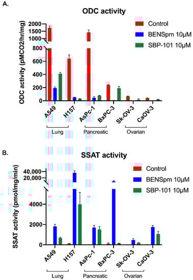Using lysates from cells treated for 24 h with 10 μΜ of either ΒΕΝSpm or SBP-101, the activity of major polyamine metabolic enzymes was determined. As expected, the BENSpm treatment reduced the ODC activity in all of the cell lines. The SBP-101 treatment reduced the ODC activity in all of the cell lines tested, except BxPC-3. In both of the ovarian adenocarcinoma lines, the SBP-101 treatment caused a reduction in the ODC activity to nearly non-detectable levels (Figure 4A). All of the tested cell lines exhibited a significant upregulation of the catabolic enzyme SSAT following the BENSpm treatment (Figure 4B). The SBP-101 treatment, however, resulted in a variable and more modest upregulation of SSAT. The AsPC-1 and H157 cell lines robustly upregulated SSAT in response to SBP-101, while the A549 and CaOV-3 cell lines exhibited a less extensive upregulation. The BxPC-3 and Sk-OV-3 cells showed little to no upregulation of SSAT in response to the SBP-101 treatment. The preliminary results indicate that SBP-101 does not influence AdoMetDC or SMOX activities (data not shown).