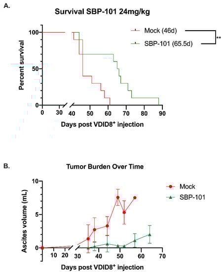 SBP-101-treated VDID8+ mice (n = 10) show a delay in tumor progression and a decrease in overall tumor burden that is correlated with an increase in median survival. Female C57Bl/6 mice were injected with 250,000 VDID8+ mouse ovarian surface epithelial cells and subsequently treated with 24 mg/kg SBP-101 (3× per week, alternating weeks, three cycles). The median survival for treated mice was 65.5 days, while the median survival for untreated mice was 46 days (A). Untreated mice produced measurable ascites prior to treated mice, and the overall volume of ascites in untreated mice was larger (B). Using ascites as a measure of tumor burden, mice treated with SBP-101 were delayed in tumor formation and exhibited an overall decrease in tumor burden.