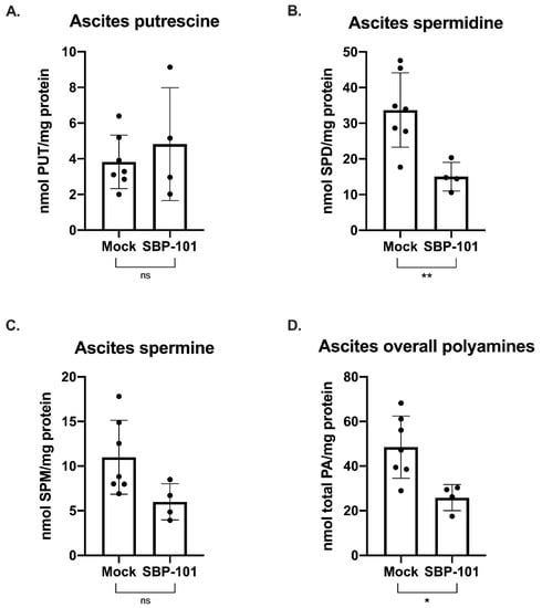 In this mouse model, the ascites volume can be used as an indicator of tumor burden. Ascites fluid was collected and processed from mock and SBP-101-treated mice throughout the original study (24 mg/kg SBP-101 3× per week, alternating weeks). The ascites was collected from mice showing more than a 20% increase in body weight (typically once or twice per week following the original ascites formation). The ascites for a polyamine analysis were collected 52 days post-VDID8+ injection, while there was a sufficient number of ascites-producing animals from both arms of the experiment. The SBP-101-treated mice showed a significant delay in the ascites formation and an overall decrease in tumor burden (Figure 5Β). A subset of the ascites fluid was analyzed by HPLC to determine changes in the polyamine levels with the SBP-101 treatment. There were reductions in spermidine, spermine, and the overall polyamine levels in the ascites of mice treated with SBP-101 (p-values: 0.008, 0.0534, and 0.014, respectively) (Figure 6). The SBP-101 levels were measured by HPLC in the kidneys and livers harvested from a subset of these mice during necropsy. SBP-101 accumulated in both the liver and the kidneys and influenced the polyamine levels in these organs. (Supplementary Table S1).