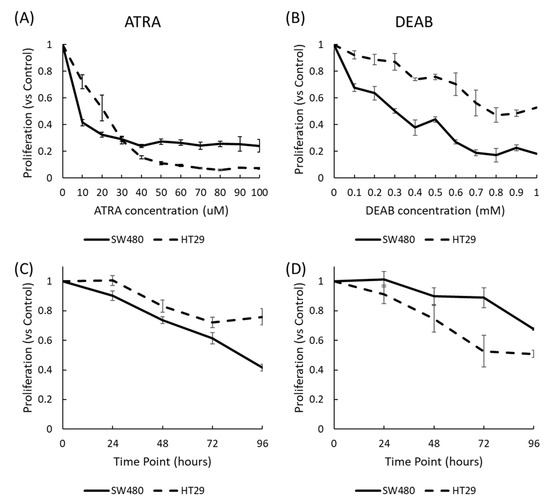 We examined the effects of both ATRA and DEAB on the proliferation of two CRC cell lines, HT29 and SW480. Note that HT29 cells contain wild-type RAR and RXR genes, while SW480 cells have mutations in the RARA and RXRG genes [24]. First, IC50 concentrations were determined for ATRA and DEAB in HT29 and SW480 cells (Figure 1A,B). We found that the IC50 concentration for ATRA was 10 µM for both cell lines, which is consistent with prior studies [7,23,25]. The IC50 concentrations for DEAB were 100 µM for SW480 and 1 mM for HT29. Next, we performed a time course experiment up to 96 h using the IC50 values of ATRA and DEAB for HT29 and SW480 cells. The results showed that both cell lines had reduced rates of proliferation when treated with ATRA or DEAB in comparison to untreated cells (Figure 1C,D) and that the decrease in CRC cell proliferation occurred in a time-dependent manner.