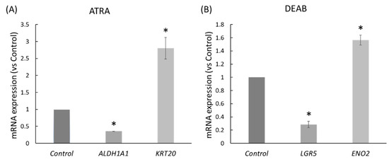 ATRA and DEAB treatments reduce the expression of stem cell markers and increase the expression of markers of cell differentiation in HT29 cells. Nanostring analysis of significant (p < 0.05) changes in the expression of ALDH1A1, KRT20, LGR5, and ENO2 in CRC cells treated with ATRA (A) and DEAB (B) at IC50 concentration for 96 h. Asterisks indicate significance compared to vehicle control treatment (p ≤ 0.05).