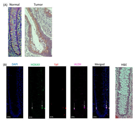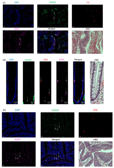 We obtained 5 µm formalin-fixed, paraffin-embedded sections of human colonic tissues from Christiana Care Health System. Tissue samples involved matched normal and malignant colonic tissue pairs (n = 5 or more tissue pairs). Specimens were deparaffinized using Citri Solv (Thermofisher Scientific, Waltham, MA, USA) solution and rehydrated in ethanol. Next, specimens were quenched for peroxidase activity in 3% H2O2 in methanol. Antigen retrieval was performed in 1× Antigen Retrieval Solution (pH 6.0, Thermofisher Scientific, Waltham, MA, USA) at 95 °C for approximately 30 min. Slides were allowed to cool to room temperature and washed in distilled H2O. Next, specimens were soaked in a blocking solution for 10 min and incubated in primary antibody overnight at 4 °C. Slides were then washed 3× in TBS-T and incubated in secondary antibodies at room temperature for 2 hours followed by an additional 3 washes in TBS-T. IHC slides were then stained with metal-enhanced DAB (Thermofisher Scientific, Waltham, MA, USA) and counterstained with hematoxylin. Stained IHC slides were then dehydrated in 90–100% ethanol and in Citra solv solution before applying mountant. IF slides were instead stained and mounted with ProLong Glass Antifade Mountant with NucBlue Stain (Thermofisher Scientific, Waltham, MA, USA). IF Images were taken with a ZEISS Epi-fluorescence microscope (Zeiss Microscopy, Jena, Germany) and Zen software (Zeiss Microscopy, Jena, Germany). The primary antibodies used were HOXA9 (1:100, ab191178 Abcam, Cambridge, UK), CGA (1:100, M0869 Dako, Copenhagen, Denmark), ALDH (1:400, PA5-18483 Invitrogen, Carlsbad, CA, USA), and Lysozyme (1:400, MA5-36114 Thermofisher Scientific, Waltham, MA, USA). The IgG primary antibody controls used were rabbit-IgG (1:250, 37415 Abcam, Cambridge, UK), goat-IgG (1:1000, 37373 Abcam, Cambridge, UK), and mouse-IgG (1:100 14-4714-82 Thermofisher Scientific, Waltham, MA, USA). For the IHC stain, we used an anti-rabbit secondary antibody (1:200, sc-2357 Santa Cruz Biotechnology, Dallas, TX, USA). For the IF stains, we used ALEXAFLUOR secondary antibodies 488 anti-rabbit (1:100, A11008 Invitrogen, Carlsbad, CA, USA), 594 anti-mouse (1:100, A21203 Invitrogen, Carlsbad, CA, USA), and 647 anti-goat (1:100, A21447 Invitrogen, Carlsbad, CA, USA).