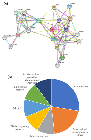 Our bioinformatics analysis utilizing the STRING database identified a network of 20 proteins predicted to functionally associate with HOXA9 based on their known and/or predicted interaction with HOXA9 (Figure 5A). A functional annotation chart from the DAVID analysis software showed eight genes related to RNA transport, three genes related to the TGF-β signaling pathway and the cell cycle, and another subset of three genes related to other signaling pathways regulating stem cell pluripotency (Figure 5B and Table 2). Notably, six genes—MLLT3, MEIS1, PBX1, PBX3, HOXA10, KMT2A—were found to play a role in transcriptional dysregulation in cancer.