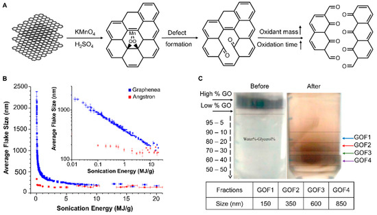 Approaches to reduce the lateral size of GO through (A) increasing the oxidant mass and the time of oxidation during synthesis, which causes ruptures in defected regions of GO flakes. The figure is adapted from [33,58] with open access permission. Copyright © 2020 Tufano, Vecchione, and Netti. (B) Increasing the ultrasonication time and energy, leading to a decrease in the size of GO from 2 µm to 150 nm. The figure is reprinted with permission from [58]. Copyright 2017 American Chemical Society. (C) Centrifugation and fractionation of 0.01 mg/mL GO in water–glycerol mixture at 3000× g for 1 h. The figure is reprinted with permission from [59] Elsevier.