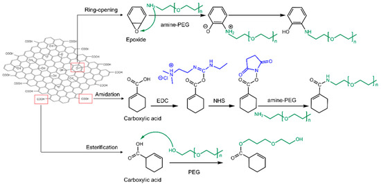 It should be noted that in some studies, PEGylation was carried out through the ring-opening reaction of epoxide groups and nucleophilic attacks on carbonyls [17], while in other studies the amidation strategy was used to modify GO with polymers and peptides [62,67,88].