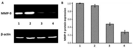 MMP-9 protein expression determined by Western blot analysis (A) and intensity analysis of (B) MMP-9 expression as the ratio of MMP-9 to β-actin from Western blot results: (1) PBS; (2) GO-PAMAM; (3) GO-PAMAM/MMP-9 (weight ratio of 10:1); (4) PEI-25k/MMP-9 (weight ratio of 4:3) [87]. Figures are reprinted with permission from Elsevier.