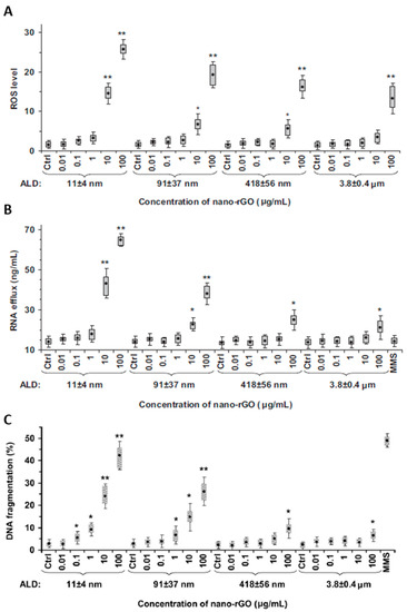 (A) ROS-generation-, (B) RNA-efflux-, and (C) DNA-fragmentation-induced toxicity of rGO flakes of different sizes (ALD: average lateral dimension; *: p < 0.05, **: p < 0.01) [112]. Figures are reprinted with permission from Elsevier.
