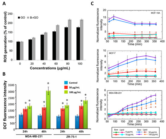 Therefore, it may be possible to exploit GO-based nanocarriers to selectively induce an increase in oxidative stress at the oncological site to induce cancer cell death [119]. In several studies performed on breast cancer cells (i.e., MCF-7, MDA-MB-231 and 4T1 cells) [119,135,147,148], naked and functionalized GO have demonstrated the ability to induce cell death in such pathological cells by inducing the generation of ROS species. Farell et al. showed different trends of oxidative stress in two cancerous (i.e., MCF-7 and MDA-MB-231) and one non-cancerous (i.e., MCF-10A) cell line (Figure 5) [119] when exposed to naked and lipid-functionalized rGO carriers. However, the ROS levels recorded in all cell lines in response to naked rGO administration were remarkably high. This could indicate that non-functionalized rGO is not an adequate material for breast cancer treatment, as such high ROS concentrations could result in an increased risk of mutations of normal breast cells into tumor tissue. Even when tested in lower doses than GO, rGO was shown to induce the same or higher levels of cell death, depending on the time and dose of exposure to cells. This phenomenon can be related to the higher affinity of rGO to the cell membrane, which increases the hydrophobic interactions between them. In addition, some chemical agents used for GO reduction can generate metallic impurities and organic contamination, causing alterations in the interaction with cells, leading to cell membrane damage and apoptosis.