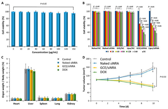 To prevent the overexpression of Survivin protein, an inhibitor of apoptosis, Survivin siRNA, was delivered to breast cancer cells through GO-modified chitosan and R8 [51,64]. Both studies showed that according to the Tyndall phenomenon, the covalent modification of GO with either chitosan or R8 increased the carrier stability in aqueous solutions, which might have been due to the electrostatic shielding effect. Their result demonstrated that GO–chitosan and GO–R8 loaded with Survivin siRNA induced 44% and 50% inhibition of the related-protein expression in vitro and in vivo, respectively. Therefore, the polymer modification was essential, and a 30:40 (w/w) N/P ratio was required to protect the siRNA in the GO carrier system [51,64].