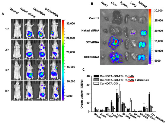 Figure 3A illustrates the capability of the GO/R8/anti-HER2/Survivin-siRNA nanocarrier to inhibit the relative protein expression of MCF-7 cells. The same phenomenon can be observed for MMP-9 shRNA loaded on GO modified only with PAMAM, where 10 mg of the carrier system was required to deliver 1 mg of the shRNA in breast cancer cells in vitro and in vivo to cause 52% gene silencing (Figure 3B) [87]. Additionally, Izadi et al. [65] and Maheshwari et al. [66] reported that the functionalization of GO with trimethyl chitosan (TMC) and chitosan oligosaccharide changed the zeta potentials of GO from −29 to +38 mV and from −43 to +31 mV, respectively. This result was beneficial for the homogenous dispersion and effective interactions with gene derivatives. The combination of GO-TMC loaded with Dinaciclib and HIF-1α siRNA, which is defined as a hypoxia-inducible factor, resulted in 62% gene silencing in 4T1 cells in vitro. Moreover, this approach could protect the siRNA for 18 h, while GO grafted with chitosan oligosaccharides loaded with EGFR siRNA caused protein inhibition in MCF-7 and MDA-MB-231 cells. Other studies have reported on the delivery of siRNAs using R8-grafted GO, and the links were through either amidation or electrostatic interactions, which provided sufficient positive charges with its -NH2 terminals for siRNAs to be absorbed [51,67,70].