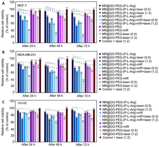 PEGylation is a well-known GO modification approach due to its ability to make GO flakes stable in biological dispersions. It assists GO carriers in bypassing the body’s immune system [70]. The colloidal stability of GO-PEG in aqueous solution is due to the steric hindrance of PEG’s hydrophilic chains and the repulsion between its amine groups [70]. For this reason, amine–PEG has been used to functionalize GO with the purpose of delivering various miRNAs and siRNAs to breast cancer cells, including: (1) miRNA 101 and Rictor siRNA, which are regulators of the PI3K/AKT pathway and responsible for cell metabolism and proliferation; (2) EPAC1 siRNA to inhibit EPAC1 protein, which is responsible for cell metastasis; (3) cell death (cd) siRNA to induce apoptosis; (4) P-gp siRNA to inhibit multidrug resistance protein (P-gp) [17,62,67,70,88]. Despite its capability, PEG is commonly combined with other polymers to functionalize GO. It has been shown that PEG maintained the stability of gold nanoparticles associated with GO for four weeks without any aggregation. The results showed that the zeta potential of the gold nanoparticle–GO shifted to negative with PEGylation and could only retard miRNA 101 at the GO–carrier/miRNA ratio of 3.8. On the other hand, adding PLA to the carrier could alter the negative charge of the carrier to positive and retard the migration of miRNA at all GO–carrier/miRNA ratios lower than 3.8 (e.g., 2.8, 1.5, and 1). As a result, the release of miRNA-101 in MCF-7 and MDA-MB-231 cells could induce apoptosis by activating apoptotic pathways after 24 h, and it decreased the cell viability of MCF-7 and MDA-MB-231 to 62% and 64% with gold nanorods and nanoparticles, respectively [62].