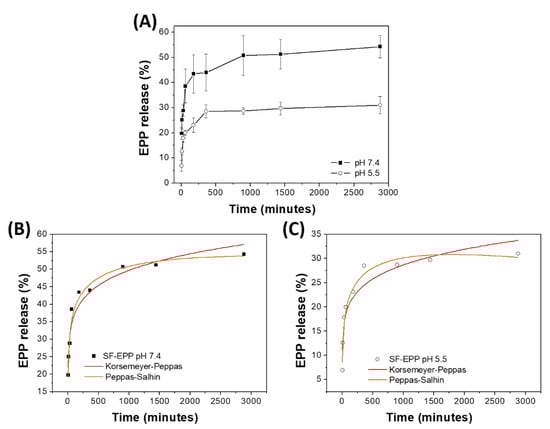 | SF-EPP pH 7.4 | 20 ± 2 | 0.13 ± 0.01 | 0.944 | 18 ± 2 | −1.56 ± 0.28 | 0.973 | 12 |