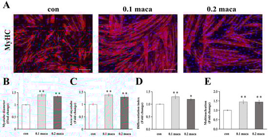The results of this study showed that the addition of maca promotes skeletal muscle hypertrophy and differentiation. Studies thus far have shown that maca promotes reproductive health, neuroprotection, antioxidants, antifatigue, antitumoral, liver protection, anti-memory impairment, and immune regulation [,,,,,,,]. The results of our study corroborate multiple antiaging effects of the natural food maca, which may be helpful to prevent sarcopenia and improve the quality of life of aging people. Of course, in future studies, more in vivo and in vitro studies are needed to demonstrate maca’s functions, such as testing maca in human muscle cell cultures or animal studies. Furthermore, we may need to examine the direct effects of maca extracts (e.g., triterpenoid saponins, amino acid) on skeletal muscle cell hypertrophy, differentiation, and maturation for further studies.