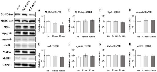There was a significant difference in the expression of MyHC-fast between the con group and the 0.2 maca group but there was no significant difference between the con group and 0.1maca group (Figure 2A). There was no significant difference in the expression of MyHC-slow between the con group and the maca groups (Figure 2B). No significant difference was found regarding the expression of MyoD and myogenin, which are related to muscle cell differentiation (Figure 2C,D). The expression of JunB which promotes muscle hypertrophy was not significantly different. The expression of myostatin, MAFbx, and MuRF-1 associated with muscle atrophy was also not significantly different.