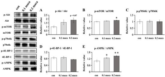 The phosphorylation of Akt in the 0.2 maca group tended to be higher than that in the con group (p = 0.07) (Figure 3A). The phosphorylation of mTOR in the 0.2 maca group was significantly higher than that in the con group (p < 0.05) (Figure 3B). There was no significant difference between the con group and the maca group regarding the phosphorylation of p70S6K (Figure 3C). There was no significant difference between the con group and the maca group in the phosphorylation of 4E-BP-1 (Figure 3D). The phosphorylation of AMPK in the 0.1 maca group (p < 0.05) and 0.2 maca group (p < 0.01) was significantly higher than that in the con group (Figure 3E).