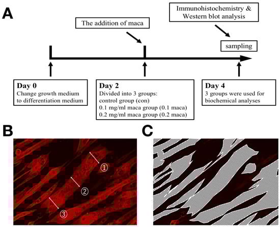 The experimental design is summarized in Figure 4A. On day 2 of the induction of differentiation, the myotubes were divided into three groups. The control (con) group was incubated normally, and the maca groups were treated with two different concentrations of maca: the “0.1 maca” group was treated with 0.1 mg/mL of maca and the “0.2 maca” group was treated with 0.2 mg/mL of maca for 48 h. On day 4, the three groups were used for biochemical analyses. The maca extract (lot. no. MCP-001) was provided by Bizen Chemical Co., Ltd. (Okayama, Japan). The extracts were obtained by ethanol extraction and spray drying. The maca extract, containing triterpenoid saponins [], was dissolved in dimethyl sulfoxide (DMSO; Wako, Japan) and the solution mixed with a differentiation medium was passed through a syringe filter (Sartorius, Germany); DMSO without maca was added to the con group.