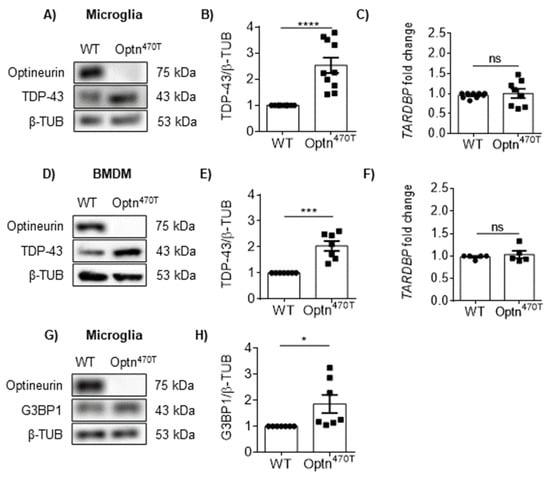 2.2. Optineurin Insufficiency Led to an Increase of TDP-43 and G3BP1 in Primary Microglia and Macrophages