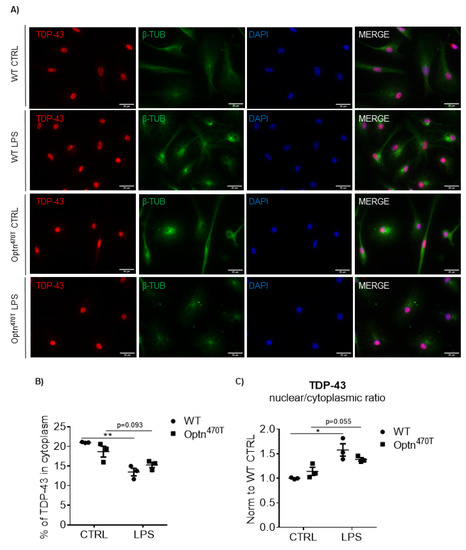 - Correia, A.S.; Patel, P.; Dutta, K.; Julien, J.-P. Inflammation Induces TDP-43 Mislocalization and Aggregation. PLoS ONE 2015, 10, e0140248. [Google Scholar] [CrossRef] [Green Version]