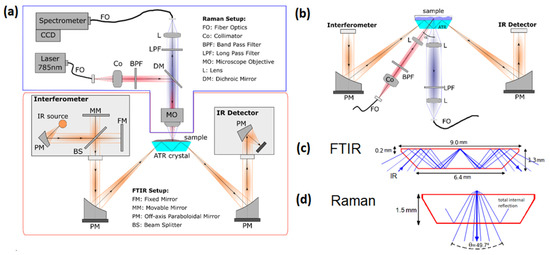 Schematic of the combined FTIR–Raman setup. (a) Upright configuration for micro-Raman. (b) Inverted off-axis configuration for Raman. Subfigures (c,d) illustrate ray tracing within the ATR crystal for both techniques: (c) Raman collection arm and (d) FTIR with three internal reflections.