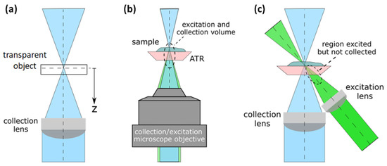 (a) Diagram of the Raman depth profile assembly. (b) Collection and excitation scheme with a microscope objective in the 180° geometry. (c) Collection and excitation scheme with different lenses in oblique configuration.