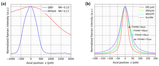 The FWHM of these curves are an indicator of the depth resolution of the system for each specific sample [37]. In the case of Figure 3a, the FWHM is found to be 44 µm for the smallest fiber core size of 105 µm, and 75 µm for the bundle of eight fibers of 400 µm core each. The results show that the smallest fiber captures signals from a small volume, as expected from a confocal configuration. It can be concluded that the efficiency (signal-to-noise ratio SNR) of collecting a small volume by the collection optics is better with a small fiber since it rejects the contribution of the volume surrounding the Raman signal collection volume.
