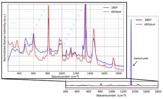 A further comparison between the two geometries, oblique and 180°, was carried out by measuring a thin film of PMMA (polymethyl methacrylate). The film of 50 µm thickness was placed on top of the ATR diamond crystal. Figure 4 shows the spectrum of the PMMA taken with the two collection/illumination geometries. One sees that the Raman spectrum of the PMMA is strongly affected by the Raman signal of the diamond, which has a strong main peak at 1333.1 cm−1 and dominates the Raman signal of the film. A rescaling allows the bands of the PMMA film to be seen. The diamond peak appears stronger in the case of the 180° configuration because a larger volume of the diamond is excited and collected (Figure 2b). Furthermore, the depth profile for the 180° configuration shows that the Raman volume is in the order of millimeters (Figure 3b), causing part of the sample signal and part of the crystal signal to be captured. However, in the oblique configuration, where a quite large volume of the diamond is illuminated and the corresponding Raman signal is generated, this Raman signal is not collected by the collection lens, as shown in Figure 2c. As can be seen in Figure 3b, the Raman volume for the oblique configuration is smaller than for the 180° configuration, resulting in strongly reduced interferences from the diamond, and from the sample itself, thereby changing the dynamics of the signal because of a reduced background.