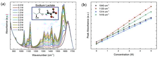 Figure 5a shows the FTIR spectra for sodium lactate concentrations in the range of 0.0–5 M. The figure also shows the chemical structure and a stick-and-ball figure of lactate. Figure 5b presents the calibration curves of the peak intensities at 1040 cm−1 (black), 1120 cm−1 (red), 1314 cm−1 (blue), and 1416 cm−1 (green) as a function of the sodium lactate concentration. All peaks display excellent linear trends with increasing molar concentration and coefficients of determination R2 around 0.999, which is consistent with Equation (2). The calibration parameters of the linear regression are given in Table 1, along with the limit of detection (LoD) for each vibrational peak, demonstrating the ability to measure the analyte with concentrations as low as 0.0297 M.