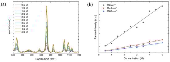 Figure 6a presents the Raman spectra for various concentrations of sodium lactate in the range of 500–1200 cm−1, which display the main vibrational modes. Figure 6b shows the calibration curves of the Raman peak intensities at 856 cm−1 (black), 1043 cm−1 (red), and 1086 cm−1 (blue). Consistent with Equation (2), these peak intensities follow a linear trend with increasing molar concentration. The parameters of the linear regressions are included in Table 2, and all lines exhibit coefficients of determination greater than 0.96, which demonstrate excellent agreement of the data with a linear trend. The LoD for each vibrational peak is also presented, demonstrating the ability to detect analytes with concentrations as low as 0.05 M.
