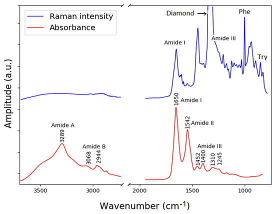 The FTIR spectra of dried BSA were acquired with 4 cm−1 resolution and an average of 32 scans. Raman spectra were taken with 4 cm−1 spectral resolution with a laser power of 20 mW, 100 acquisitions, and with an exposition time of 1 s. A 63x (NA 0.75) microscope objective was used to collect the signal due to the weakness of the Raman signal generated in this sample. The IR absorbance spectrum and the Raman spectrum of a BSA sample in the region of 3700–800 cm−1 are shown in Figure 7. For noise reduction, both spectra were smoothed with a Savitzky–Golay filter of 7-point window and third-degree polynomial sampling at 3.67 cm−1. Additionally, the Raman spectra were baseline corrected by means of asymmetric least squares (ALS) fitting. In the Raman spectrum, the diamond band can be seen interfering with the amide III band; however, the other bands are seen clearly. In the FTIR spectrum, the region between 1800 and 2600 cm−1 (not shown) is dominated by noise due to the low optical transmission of the diamond in that region.