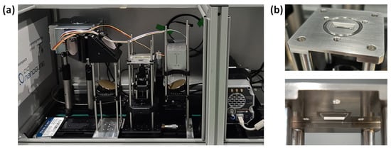 The ATR crystal was manufactured by a company that grows synthetic diamonds of any dimension and geometry [47]. The crystal was fabricated with a metallic mounting as a stable and safe holder, as shown in Figure 8b. For biosafety reasons, the holder was designed with holes that allow the mechanical coupling of a cover plate that protects the sample and the user while measurements are taken; thus, any transfer of biological or hazardous material to the outside is avoided. The crystal holder acts as a little container for retaining liquid samples directly on the crystal.