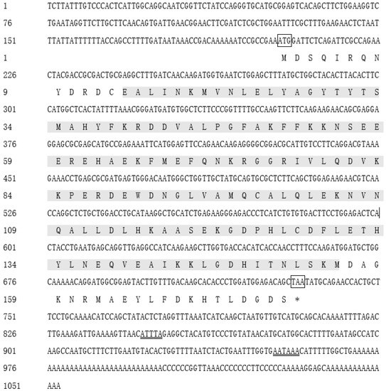 The full-length cDNA sequence of Ciferritin (GenBank accession no. MK934175.1) is 1053 bp in length. It consists of a 531 bp open-reading frame, a 202 bp 5′-terminal untranslated region, and a 320 bp 3′-terminal untranslated region. The predicted Ciferritin protein encodes 176 amino acids. The calculated molecular weight of Ciferritin is 86.81 kDa, and the isoelectric point is 4.98. In the 3′ non-coding region, polyadenylation signal site “AATAAA”, and the unstable motif “ATTTA” were identified (Figure 1).