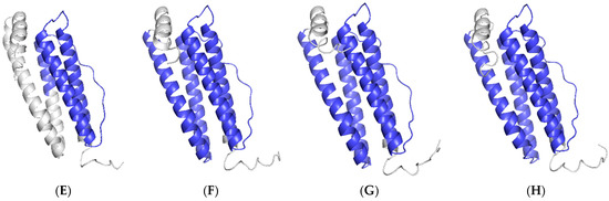 Tertiary structure of ferritin proteins. Ferritins from (A): grass carp (Ctenopharyngodon idella), (B): black carp (Mylopharyngodon piceus), (C): zebrafish (Danio rerio), (D): African clawed frog (Xenopus laevis); (E): Chinese soft-shelled turtle (Pelodiscus sinensis), (F): red junglefowl (Gallus gallus), (G): mouse (Mus musculus) and (H): human (Homo sapiens).