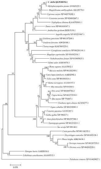 - Li, Y.G.; Jin, S.; Zhao, X.; Luo, H.; Li., R.; Li., D.; Xiao., T.Y. Sequence and expression analysis of the cytoplasmic pattern recognition receptor melanoma differentiation-associated gene 5 from the barbel chub Squaliobarbus curriculus. Fish Shellfish Immunol. 2019, 94, 485–496. [Google Scholar] [CrossRef] [PubMed]