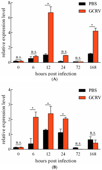 Expression level change in Ciferritin after PBS treatment and GCRV infection in the spleen (A) and the kidney (B). An asterisk (*) denotes a significant differences (p < 0.05) between PBS and GCRV treatment groups and n.s. indicates no significant difference (p > 0.05).